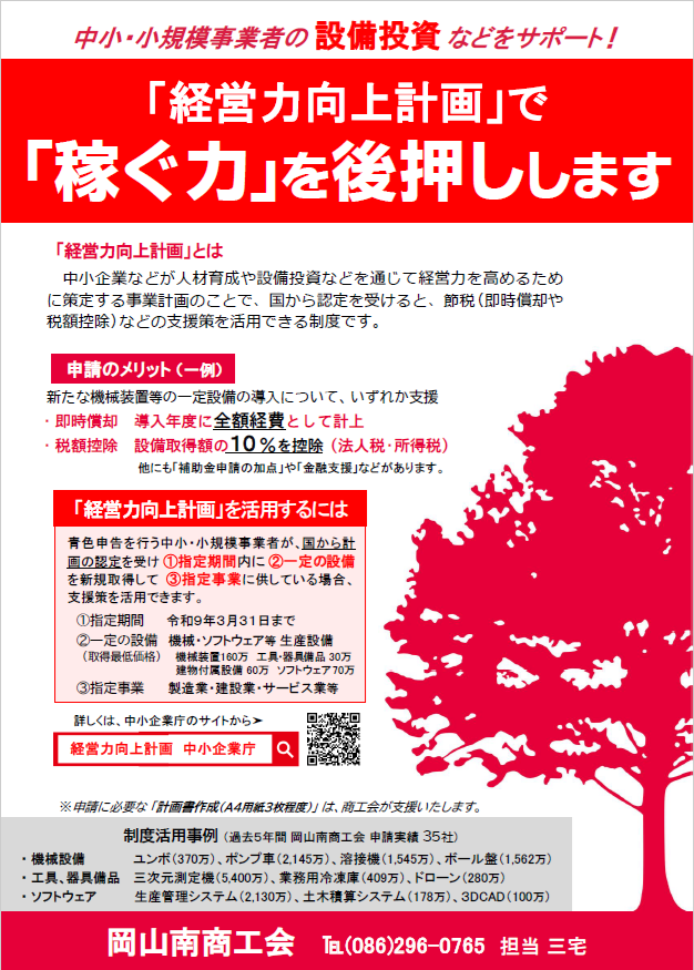 商工会と「経営力向上計画」を申請してみませんか 経営力向上計画とは、中小企業や小規模事業者が、これからの経営をより良くしていくために、自社の強みや課題、取り組み内容を整理し、国の認定を受ける制度です。 設備投資や業務の効率化、人材育成などを計…