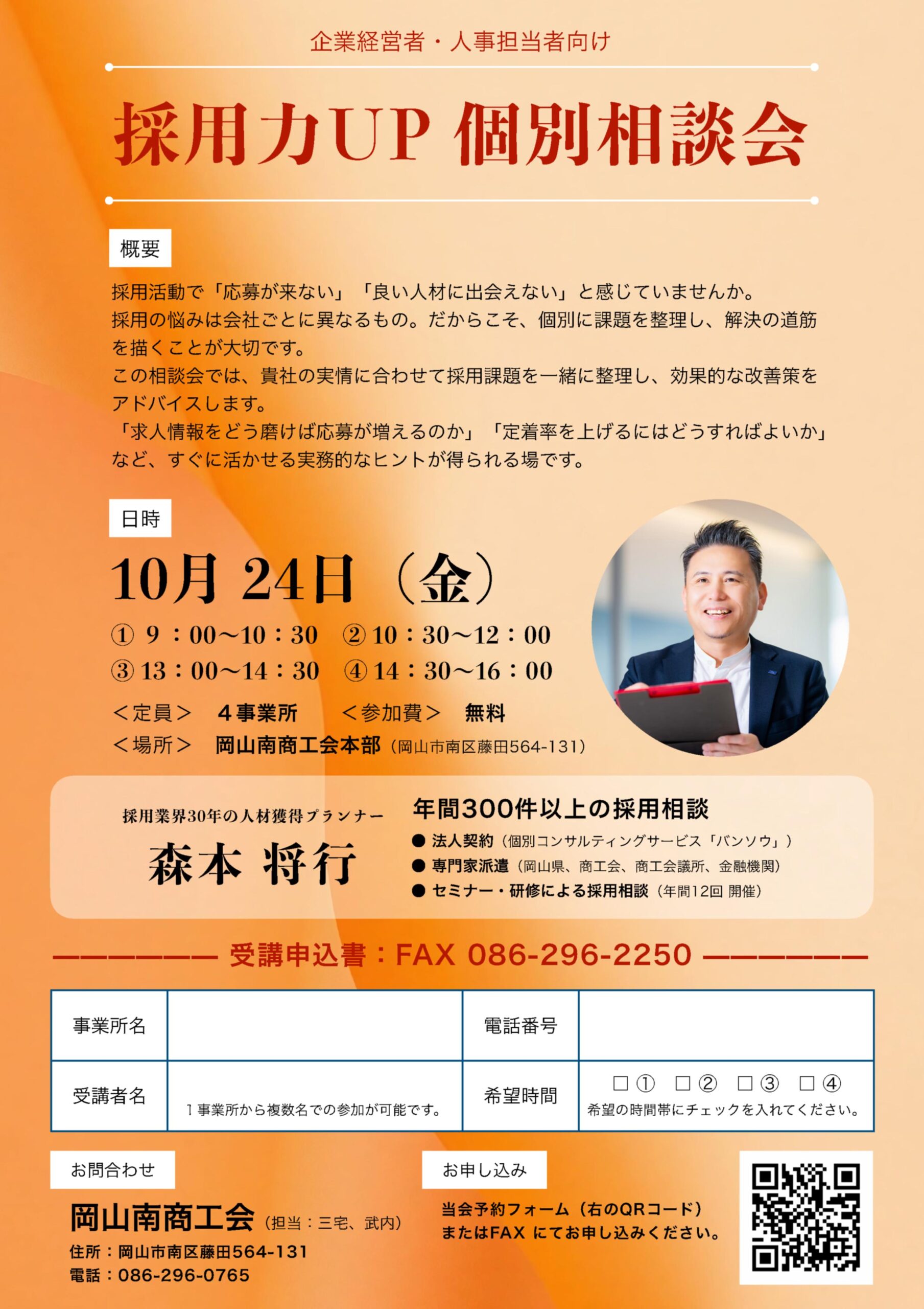 採用活動で「応募が来ない」「良い人材に出会えない」と感じていませんか。採用の悩みは会社ごとに異なるもの。だからこそ、個別に課題を整理し、解決の道筋を描くことが大切です。 この相談会では、貴社の実情に合わせて採用課題を一緒に整理し、効果的な改善…