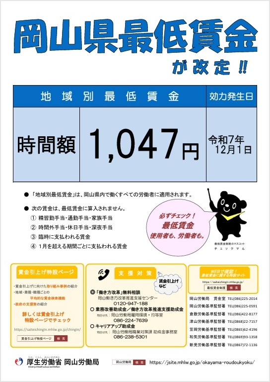 (関連リンク先) 岡山労働局 岡山県最低賃金2025年 厚生労働省 賃金引上げ特設サイト 厚生労働省 「賃上げ」支援助成金パッケージ